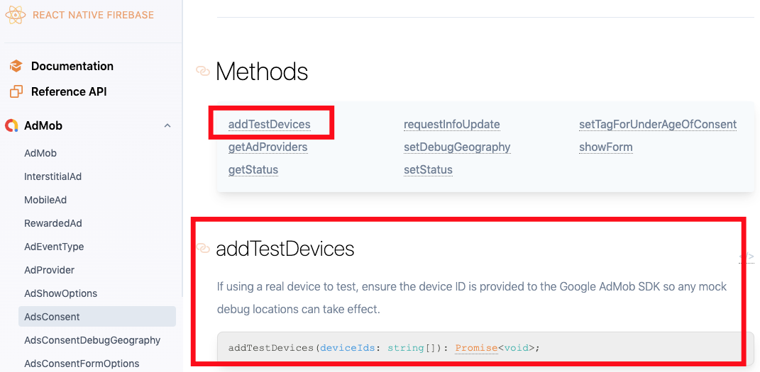 (* Java에서의 method명과 다르다. JAVA는 addTestDevice인데, react-native의 method명은 복수인 addTestDevices 이다)