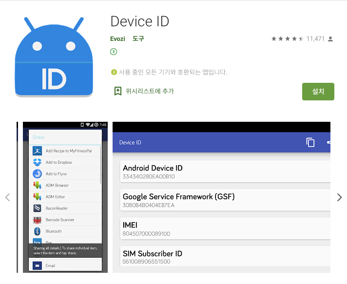 Play Store에 검색해 보면, 다음과 같은 Device ID 확인 앱들이 있습니다. (미리 말씀 드리면, 아~~~무 의미 없습니다.)