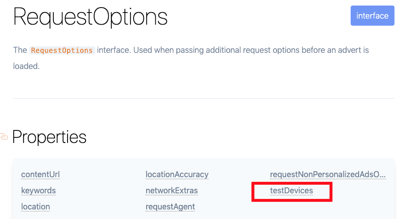 createForAdRequest Method는 2번째 인자로 requestOptions를 입력 받고 있으며, requestOptions에 testDevices 속성이 있다. testDevices 속성에 DeviceId를 입력함으로써 test device를 지정할 수 있습니다.